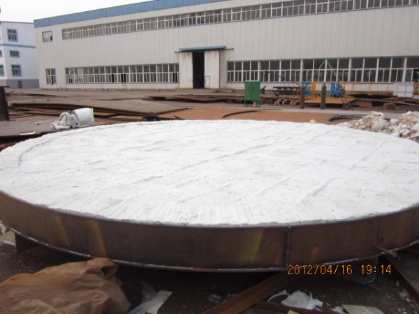 ● 井式滲碳爐耐火保溫爐底部分:采用模塊+層鋪毯爐襯結構,總厚度250mm,由熱面到冷面依次為模塊(厚度為200mm),層鋪(厚度為50mm)