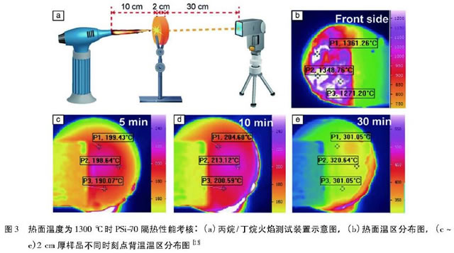 在復(fù)合氣凝膠研究方面,主要包括兩種策略:一種是在Si02氣凝膠中引入其他氧化物氣凝膠,形成一種二元或三元?dú)饽z,抑制氣凝膠的燒結(jié)以及晶粒的長(zhǎng)大;另外一 種就是與有機(jī)基體復(fù)合,形成一種有機(jī)無(wú)機(jī)雜化氣凝膠, :然后經(jīng)過(guò)后續(xù)的碳化、碳熱還原等過(guò)程形成一.種Si-0-C氣凝膠材料。Hou等的通過(guò)快速凝膠法制備了纖維增強(qiáng)Si02 ZrO2復(fù)合氣凝膠,熱導(dǎo)率低至0.0235 W/(m.K),抗壓強(qiáng)度高達(dá)0.82 MPa。Wu等 制備的Al20-Si02氣凝膠(圖2)經(jīng)1200℃熱處理后比表面積高達(dá)166 m2 lg,顯著提高了Si02氣凝膠的耐溫性能。Yu等D3以酚醛樹脂作為網(wǎng)絡(luò)結(jié)構(gòu)增強(qiáng)體與Si02 氣凝膠進(jìn)行同步聚合,制備的有機(jī)無(wú)機(jī)雜化氣凝膠(厚度20 mm)在經(jīng)過(guò)1300℃熱考核20 min后,背溫僅為300℃,同時(shí)材料正反面在30 min考核后都保持結(jié)構(gòu)完整(圖3),這對(duì)于混凝土結(jié) 構(gòu)高層建筑的防火逃生具備重大意義。趙楠等味制備的莫來(lái)石纖維增強(qiáng)Si-0-C氣凝膠在1000℃下的熱導(dǎo)率低至0.043 W1(m. K),同時(shí)經(jīng)1000 C熱煅燒之后沒有發(fā)生任何收縮。Assefa等 19以聚二甲硅氧烷和四甲基乙烯基環(huán)四硅氧烷為原料,經(jīng)1200℃惰性氛圍熱處理制備了Si-0-C氣凝膠,該材料比表面積為530 m21g,孔體積為0.649 cm3/g。Ma等制備的Si-0-C氣凝膠比表面積位于365 ~488 m21g,表觀密度位于0.265 ~ 0.335 g/cm ,抗壓強(qiáng)度較高可達(dá)3.17 MPa。