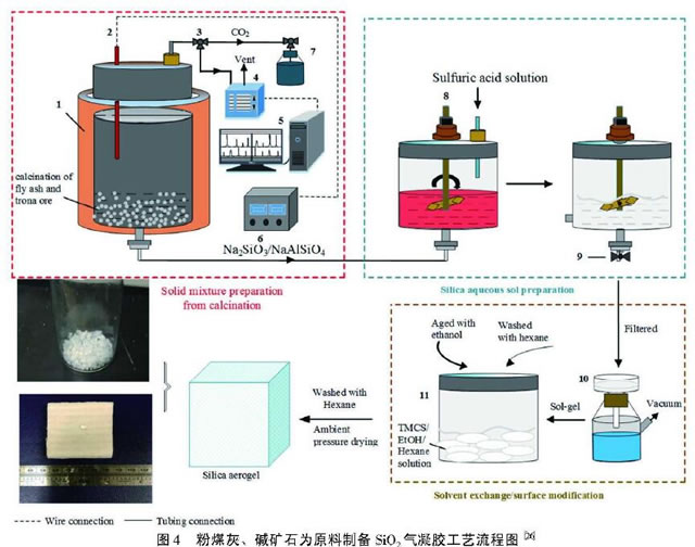疏水SiO2氣凝膠的制備主要有3種方法:蒸汽后處理法、共前驅(qū)體法以及表面烷基化法,3種方式的核心均是將氣凝膠表面的親水基團(tuán)轉(zhuǎn)化為疏水基團(tuán)。其中蒸汽后處理法就是將濕凝膠置于甲醇蒸汽中,然后將其表面的Si-OH結(jié)構(gòu)轉(zhuǎn)變?yōu)镾i-0CH3結(jié)構(gòu),從而實(shí)現(xiàn)疏水改性。蒸汽后處理法一般仍采用TEOS或者TMOS作為前驅(qū)體材料,甲醇蒸汽溫度為220~ 240 C,改性時(shí)間為10~40h20。共前驅(qū)體法主要是采用含有部分不可水解基團(tuán)的有機(jī)硅氧烷對(duì)常用的TEOS或者TMOS進(jìn)行部分替代,進(jìn)行共水解-縮聚反應(yīng),然后通過(guò)后期的很臨界干燥過(guò)程得以實(shí)現(xiàn)。由于不可水解側(cè)鏈基團(tuán)的存在,采用共水解法制備的樣品一般具備更低的密度、較差的透明度,而疏水性能顯著提升。較常見的共水解劑包括甲基三甲氧基硅烷、乙基三甲氧基硅烷、正丙基三甲氧基硅烷、正丁基三甲氧基硅烷、乙烯基三甲氧基硅烷等。Li等以 正丙基三乙氧基硅烷為共水解劑,經(jīng)常壓干燥制備了接觸角高達(dá)153的疏水氣凝膠,同時(shí)該氣凝膠的彈性模量顯著提升(0.21 MPa到0.35 MPa)。Yu等2也采用共前驅(qū)體法結(jié)合CO2很臨界干燥對(duì)于疏水SiO2氣凝膠進(jìn)行了研究,該氣凝膠接觸角為152,疏水溫度達(dá)450 C。表面烷基化法就是采用三甲基氯硅烷(TMCS)、六甲基二硅 氮烷(HDMS)等疏水改性劑,對(duì)于濕凝膠進(jìn)行表面改性,將其表面的Si-0H轉(zhuǎn)化為疏水的0Si-CH結(jié)構(gòu)。Jeong等嗎以TEOS為硅源,其濕凝膠經(jīng)TMCS疏水改性后,制備的氣凝膠接觸角高達(dá)143%。其他研究人員D4對(duì)于TEOS形成的濕凝膠結(jié)構(gòu)采用HDMS進(jìn)行疏水改性。2.3低成本Si02氣凝膠 低成本制備改性Si02氣凝膠材料主要從兩方面入手,一是采用價(jià)格低廉的水玻璃、粉煤灰、稻殼灰、礦渣等原料替代價(jià)格高昂的有機(jī)金屬醇鹽;二是采用低成本的常壓干燥技術(shù)取代很臨界干燥技術(shù)。由于常壓干燥技術(shù)中往往需要引入疏水改性劑,因此在這一過(guò)程中同時(shí)也實(shí)現(xiàn)了對(duì)SiO2氣凝膠的疏水改性。Cheng 等 23以粉煤灰為原料,采用堿激發(fā)法結(jié)合常壓干燥制備了低成本SiO2氣凝膠。該氣凝膠的密度為0.085g/cm3, 比表面積高達(dá)700m21g,接觸角為140%, 疏水溫度達(dá)360℃。Wu等 26以粉煤灰和堿礦石為原料,經(jīng)固相煅燒、酸溶、表面改性、除雜、常壓干燥等過(guò)程制備了低成本SiO2氣凝膠(圖4)。該氣凝膠的接觸角高達(dá)151°,疏水溫度可保持至476℃。Feng 等27以稻殼灰為原料,經(jīng)常壓干燥制備了低成本SiO2氣凝膠。該氣凝膠比表面積較高可達(dá) 400℃。Pan 等網(wǎng)以水玻璃為原料,經(jīng)常壓干燥在4h內(nèi)成功制備了低成本疏水Si02氣凝膠顆粒,其顆粒粒徑在20 nm左右,接觸角高達(dá)162%。