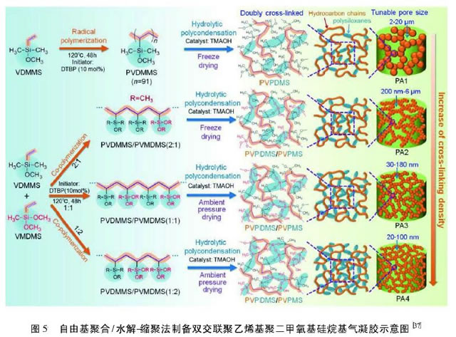 聚合物基有機(jī)氣凝膠的較大優(yōu)點(diǎn)在于聚合物分子靈活的分了設(shè)計(jì)性,性能更容易為人們所控制。其中聚合物基有機(jī)氣凝膠包括聚氨酯氣凝膠、聚脲氣凝膠、聚酰亞胺氣凝膠、聚苯并嗯嗪氣凝膠、聚間苯二胺氣凝膠等,而生物質(zhì)基有機(jī)氣凝膠包括纖維素氣凝膠、甲殼素/殼聚糖氣凝膠、藻酸鹽氣凝膠、淀粉氣凝膠、蛋白質(zhì)氣凝膠以及木質(zhì)素氣凝膠等。Leventis 等5制備的聚脲氣凝膠是由異氰酸酯和氨基類化合物反應(yīng)得到的,柔性好,聲波傳遞損失快,可作為很好的吸音材料。Xie等叫用Fe-(NO3)3氧化吡咯單體合成了三維納米網(wǎng)絡(luò)結(jié)構(gòu)的很輕高 彈性聚吡咯氣凝膠(密度為0.048 g/em)。該氣凝膠骨架由納米級(jí)和微米級(jí)的聚吡咯片晶構(gòu)成,較大吸收帶寬為6.2 GHz,填充率僅為7%,電磁吸收性能優(yōu)越。Song 等的以微球殼的聚間苯二胺為原料,通過(guò)氧化聚合對(duì)表面基團(tuán)進(jìn)行交聯(lián),經(jīng)冷凍干燥得到聚間苯二胺氣凝膠,力學(xué)性能優(yōu)異(4 mg承受100 g負(fù)荷),有機(jī)物吸附量高(827 ~ 1986 g/g),循環(huán)性能優(yōu)異。Cardea 等的通過(guò)CO2很臨界干燥將姜黃素引入到聚偏二氟乙烯六氟丙烯復(fù)合氣凝膠中,當(dāng)復(fù)合氣凝膠的質(zhì)量分?jǐn)?shù)為12%時(shí),姜黃素的較大釋放時(shí)間可延長(zhǎng)至44h。Ma等 以碳納米管作為支撐體,通過(guò)自交聯(lián)和冷凍干燥制備了無(wú)毒的聚乙烯醇?xì)饽z。該氣凝膠對(duì)豆油和原油的吸附性能優(yōu)異(自重10 ~52倍),而將其與聚吡咯氣凝膠復(fù)合后,其電導(dǎo)率達(dá)0.16 S/m,可作為導(dǎo)電氣凝膠使用。Crispin 等時(shí)制備了聚3, 4-乙烯基氧噻吩和聚苯乙烯磺酸鹽的復(fù)合氣凝膠,由于該氣凝膠在高沸點(diǎn)很性溶劑中表現(xiàn)出絕緣體和半金屬的過(guò)渡態(tài)性質(zhì),可作為優(yōu)質(zhì)的溫度、壓力去耦的傳感器。作者課題組的Chen等B也對(duì)聚合物基的聚酰亞胺氣凝膠進(jìn)行了研究,密度在0.116 ~0.386 g/cm3,比表面積在173 ~461 m21g,孔隙率高達(dá)97%,CO2吸附性能優(yōu)異。除了這些本身含有大量聚合物鏈段的聚合物基氣凝膠,另外一種就是結(jié)構(gòu)中含有大量不可水解基團(tuán)(甲基、乙烯基、丙烯基等)的硅氧烷所形成的聚合物氣凝膠。Zu等38通過(guò)聚乙烯基聚二甲基甲氧基硅烷和聚乙烯基聚甲基二甲氧基硅烷為原料,通過(guò)調(diào)控二者比例,經(jīng)自由基聚合和水解縮聚過(guò)程后,通過(guò)常壓干燥或冷凍干燥制備了性能優(yōu)越的雙交聯(lián)聚合物氣凝膠(圖5)。雙交聯(lián)聚合物中同時(shí)具備柔性的聚硅氧烷和碳?xì)滏溄Y(jié)構(gòu),因此表現(xiàn)出很好的柔性,同時(shí)該雙交聯(lián)聚合物氣凝膠密度范圍寬(20 ~200 mg/cm'), 接觸角高(140℃ ~ 157℃),機(jī)械強(qiáng)度高,可折疊和彎曲,油水混合物吸附效率高,而且熱導(dǎo)率很低(16.2~17.6 W/(m. K)),有望作為新型吸附劑、絕熱材料、傳感器、可攜帶電子設(shè)備等使用。