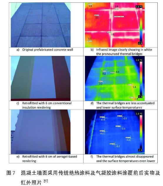 通過(guò)將顆粒狀的SiO2氣凝膠添加到水泥混凝土中,形成氣凝膠保溫砂漿與混凝土。成鎧等5制備了熱導(dǎo)率低至0.05 W/(m. K)、抗壓強(qiáng)度為0.52 MPa、線性收縮率為0.157%的氣凝膠保溫砂漿,各項(xiàng)技術(shù)指標(biāo)高于國(guó)標(biāo)要求。Wakili 等 將商業(yè)用氣凝膠砂漿用于德國(guó)某個(gè)1989年建造的30 m高建筑物的維修上,U值從傳統(tǒng)材料的1.0 W/(m2.K)降至0.3 W1(m2.K),而且氣凝膠砂漿涂覆后墻體縫隙處的熱橋消失(圖7),很好地起到了保溫絕熱的效果,同時(shí)實(shí)現(xiàn)了墻體透氣和防水,在惡劣條件下仍然具有很佳的應(yīng)用價(jià)值。法國(guó)的Ibrahim等159將SiO2氣凝膠作為砂漿填充層,并通過(guò)預(yù)筑成型、機(jī)器噴涂或人工砌筑等方式用于建筑墻面保溫,結(jié)果表明砂漿密度為200 kg/m3時(shí),比熱容為1100 kJ/(kg. K),熱導(dǎo)率低至0.027 W/(m . K)。Ng等ba將體積分?jǐn)?shù)為50%的氣凝膠加入到高性能混凝土中,制備的氣凝膠混凝土抗壓強(qiáng)度為20MPa,熱導(dǎo)率為0.55 W/(m. K)。